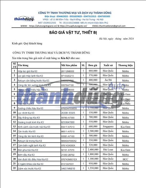 Tham khảo Báo giá phụ tùng xe Kia K3 mới nhất tại đây: